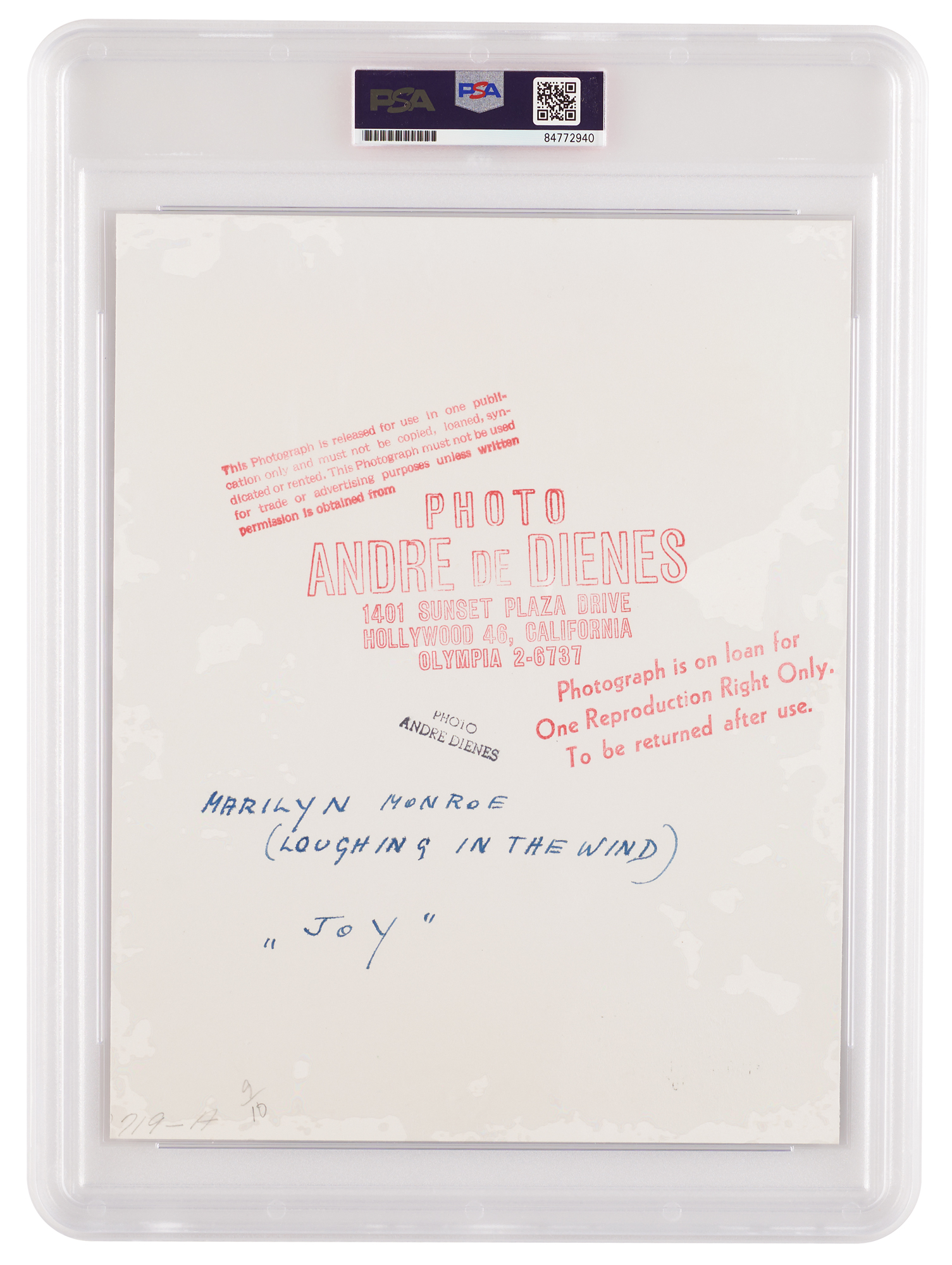 Original vintage glossy 8 x 10 close-up photo of Marilyn Monroe sans makeup laughing during a photo shoot on Malibu Beach, originally taken in 1946 by photographer Andre de Dienes and printed from the original negative during the 1950s. Reverse bears the credit stamp of Andre de Dienes, who adds a handwritten notation, “Marilyn Monroe (Laughing in the wind), ‘Joy.’” In very fine condition. Encapsulated by PSA as an authentic 'Type II' photograph, circa 1950s.