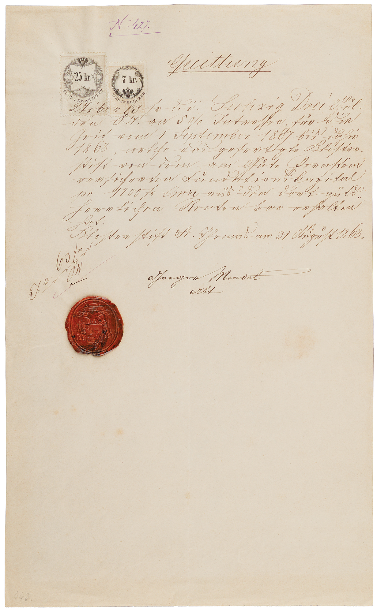 Austrian biologist and friar (1822–1884) known for his experiments in the crossbreeding of pea plants, which established many of the rules of heredity; today, he is remembered as the founder of the modern science of genetics. Rare manuscript DS in German, one page, 8.5 x 13.75, 1868. Receipt document concerning a financial transaction, issued from St. Thomas's Abbey in Brno. In full (translated): "For 63 florins, that is, sixty-three Austrian guldens, at 5 % interest, for the period from 1 September 1867 up to now in 1868, that the satisfied monastery has received in cash from the endowment capital of 1200 convention florins secured by the Pernstein manor and the manorial rights there." An official embossed red wax seal is affixed to the lower left, with two revenue stamps affixed near the top. In fine condition.