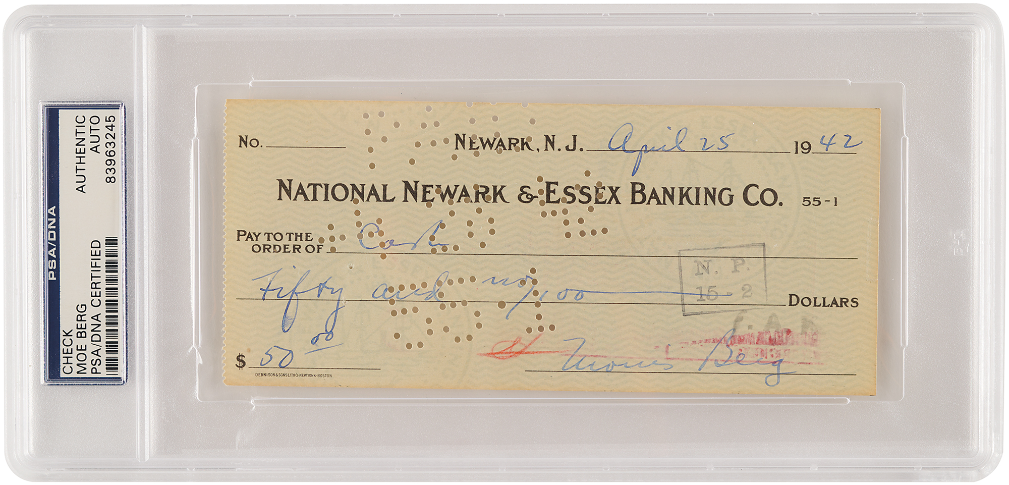 Baseball catcher (1902-1972) who also served briefly as a spy for the United States. Casey Stengel once described Berg as 'the strangest man ever to play baseball.' National Newark & Essex Banking Co. check, 6.25 x 2.75, filled out and signed by Berg, "Morris Berg," payable to Cash for $50, April 25, 1942. In fine condition. Encapsulated in a PSA/DNA authentication holder.