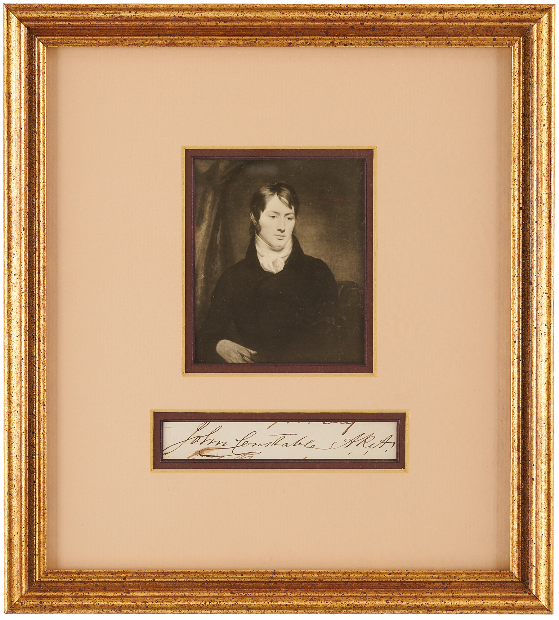 Celebrated English landscape painter in the Romantic tradition (1776–1837) who revolutionized the genre with his vivid portrayals of rural life around Dedham Vale. Rare ink signature, "John Constable, A.R.A.,” on an off-white 4.25 x .75 slip, double-matted and framed with a portrait to an overall size of 10 x 11. In fine condition.