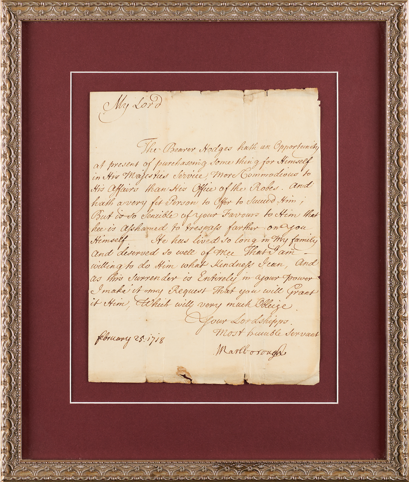 English soldier and statesman whose career spanned the reigns of five monarchs (1650–1722); his most famous descendent, Winston S. Churchill, wrote a biography of him entitled Marlborough: His Life and Times. LS signed "Marlborough," one page, 7.25 x 9.5, February 25, 1718. Letter to a Lord, in part: "The Bearer Hodges hath an opportunity at present of purchasing something for Himself in His Majesties Service, more commodious to His Affairs than for his Office of the Robes. And hath a very fit person to offer to succeed him, but is so sensible of your favors to Him that he is ashamed to trespass farther on you himself." Matted and framed to an overall size of 13 x 15.25. In very good to fine condition, with some short edge tears.