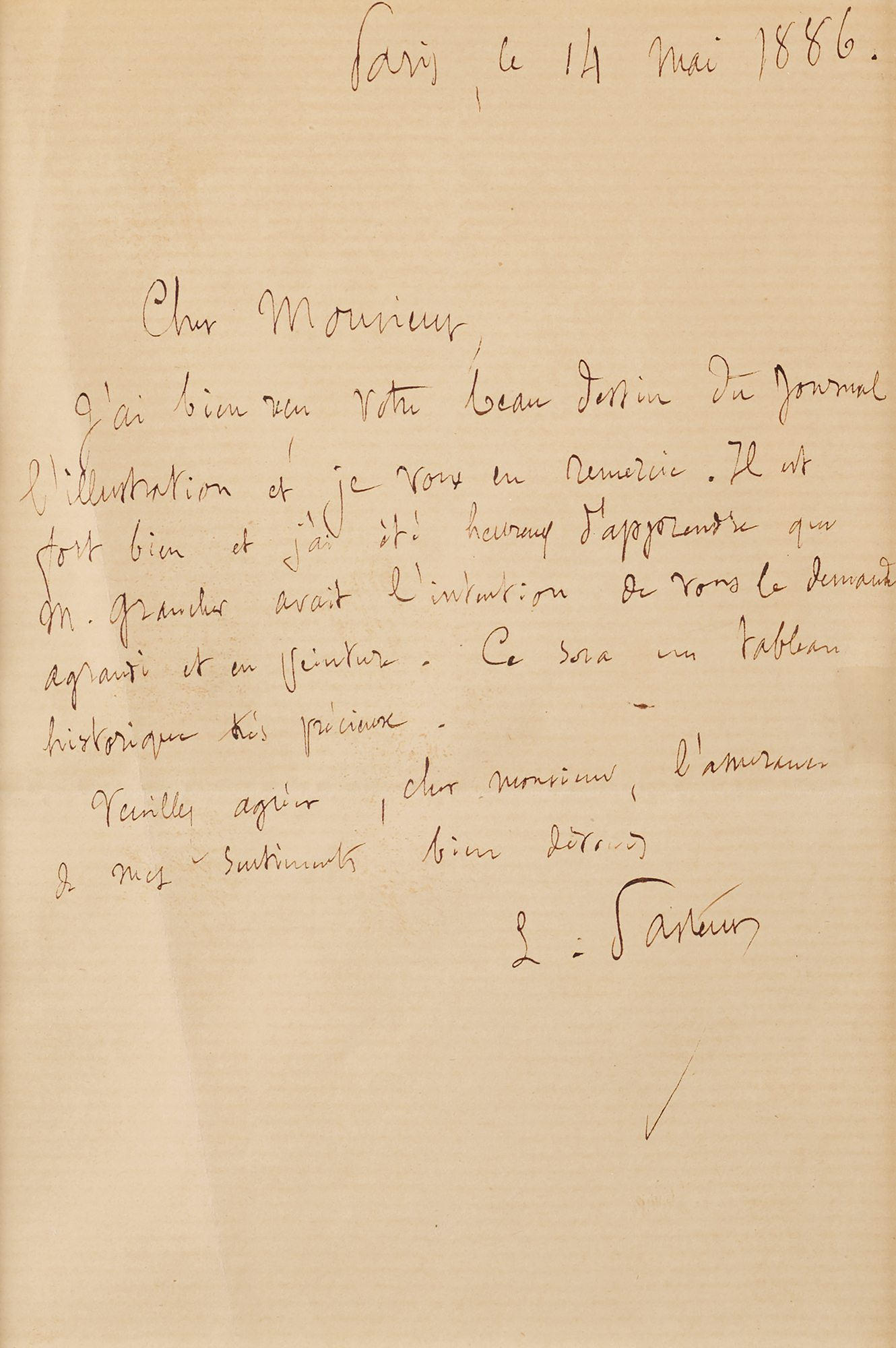 ALS in French, signed “L. Pasteur,” one page, 4.5 x 6.75, May 14, 1886. Handwritten letter expressing his appreciation for an illustration by A. Gerardin, which appeared in the French illustrated weekly newspaper L'Illustration in 1886 and showed some of the rabies patients under his care. Matted and framed with an engraved portrait and an explanatory letter by his son-in-law, René Vallery-Radot, to an overall size of 21.25 x 12. In fine condition.