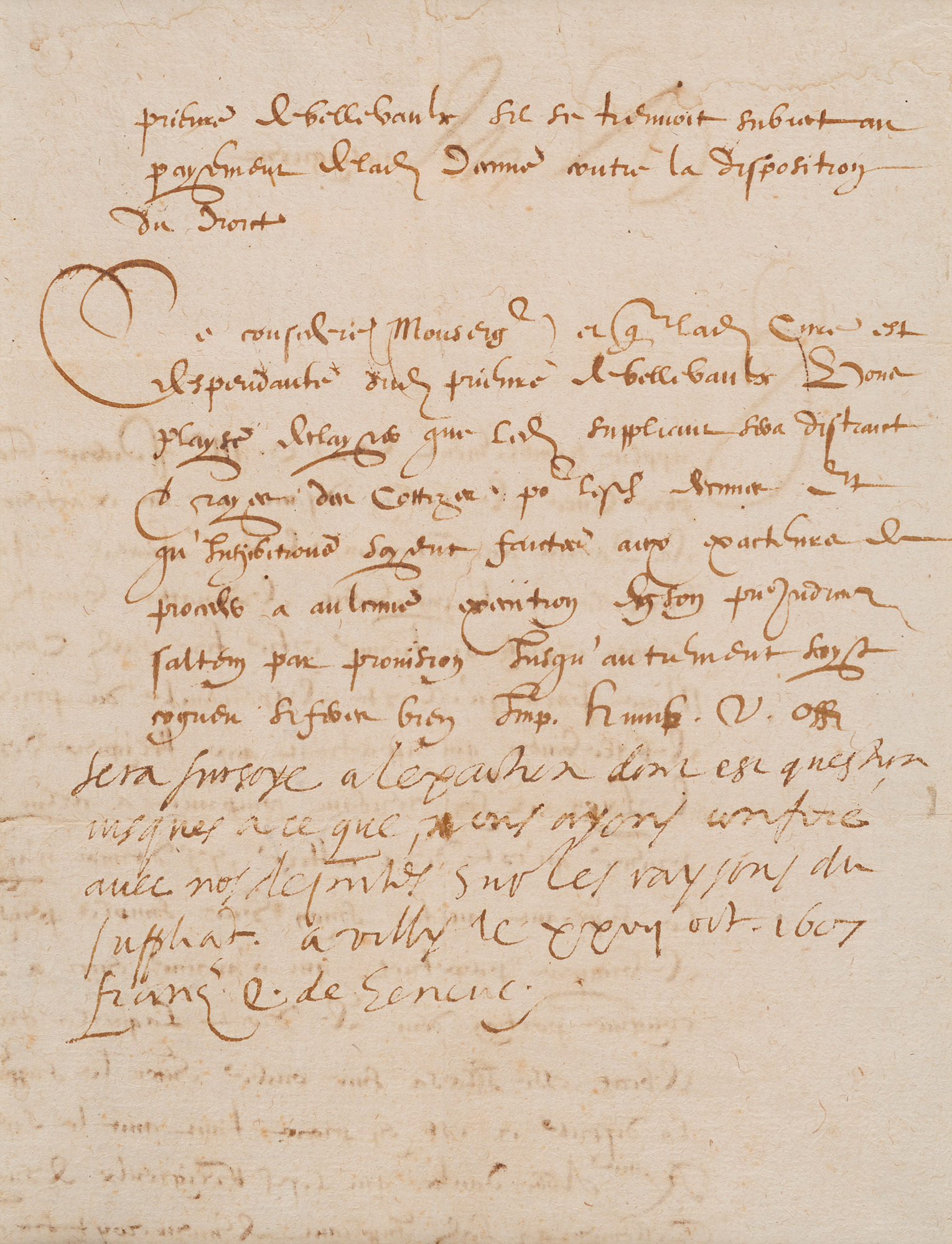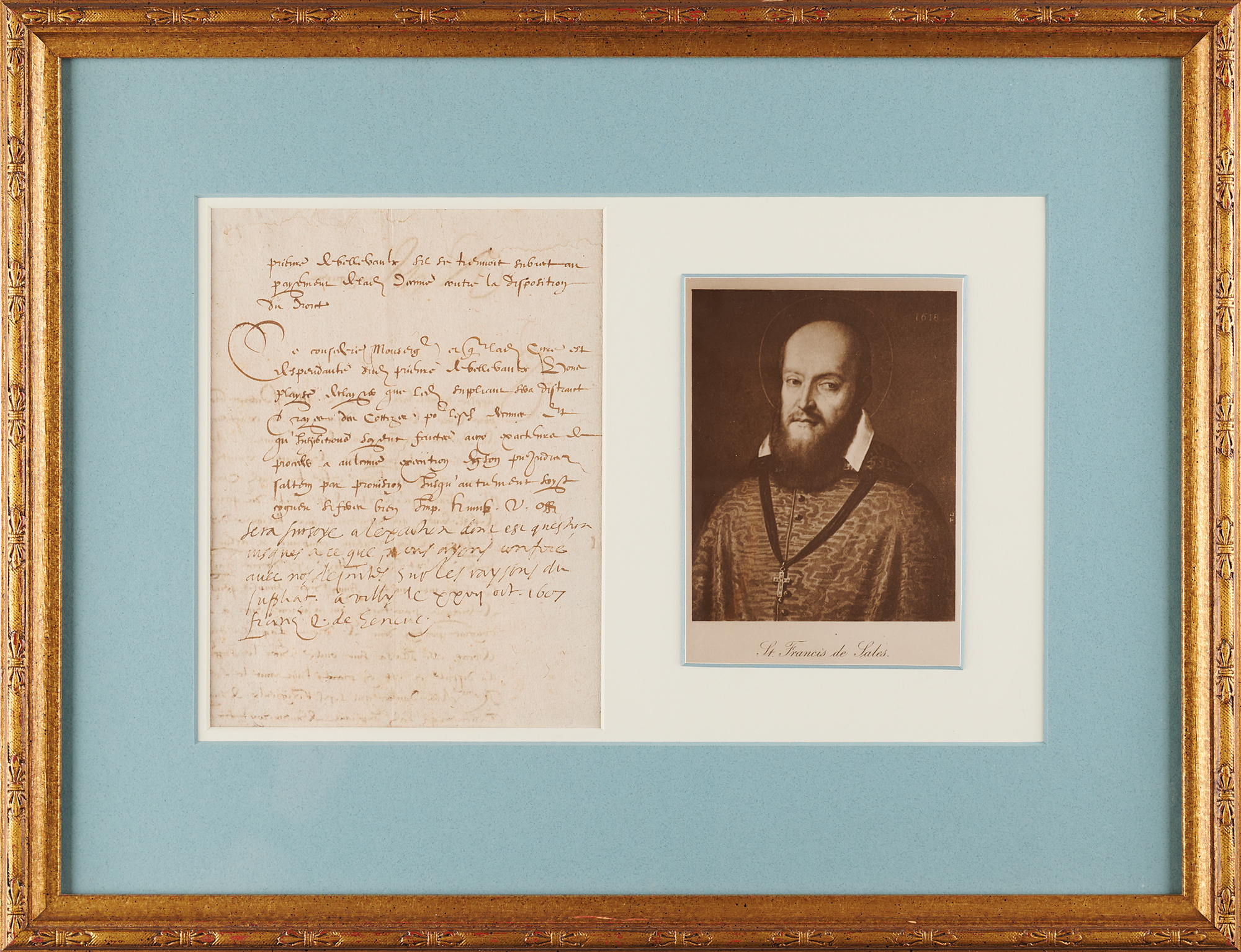Bishop of Geneva (1567–1622) who is honored as a saint in the Catholic Church, remembered as one of the greatest evangelists and most powerful confessors during the Counter-Reformation. Extremely rare ANS in French, signed “Franc's ev. De Geneve,” penned at the conclusion of a manuscript appeal for tax exemption, one page both sides, 6 x 8, October 27, 1607. The appeal, sent to de Sales while serving as Bishop of Geneva, requests for an exemption from ecclesiastical taxes. Addressed from the Swiss town of Villy, near the Lake Geneva town Evian, where de Sales was reputed to have seen a vision of St. Francis of Assisi, the Bishop’s handwritten response reads: “Exacting of taxes suspended until we have had a chance to confer with Our deputies on the reasons of the petitioner.” Double-matted and framed with a portrait to an overall size of 19 x 14.75; a window to the frame backing reveals the front of the appeal. In fine condition. Since 1536, Geneva had retained taxes formerly rendered to the Catholic Church, and the practice of ecclesiastical taxation was being challenged across Europe by the end of the 16th century.
