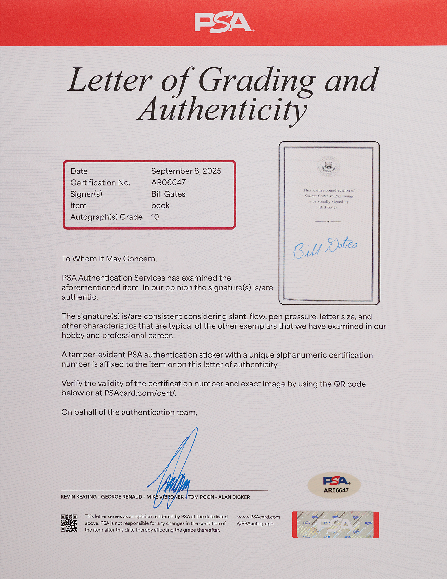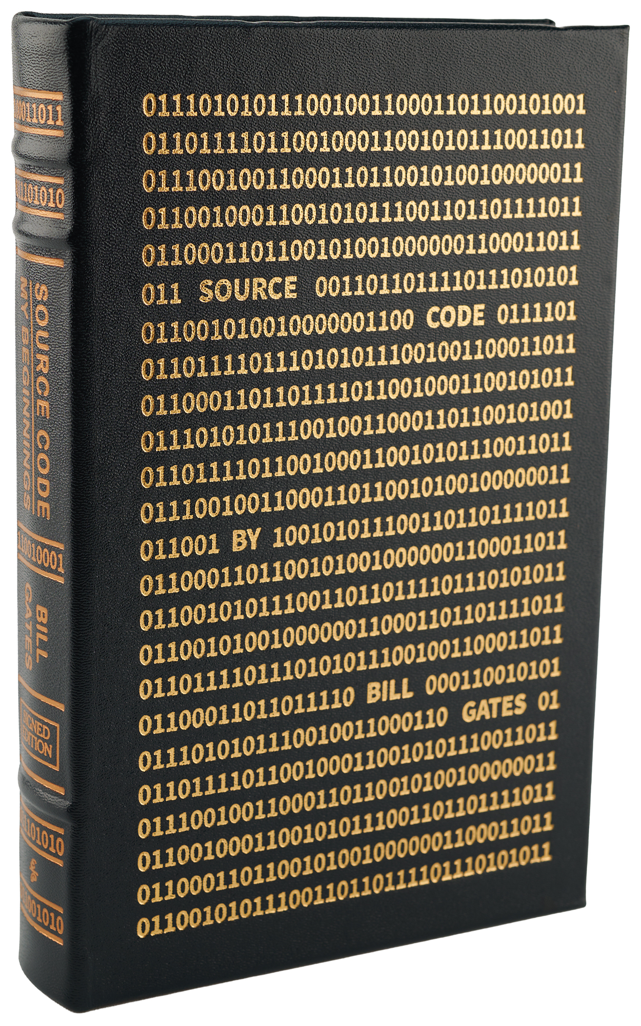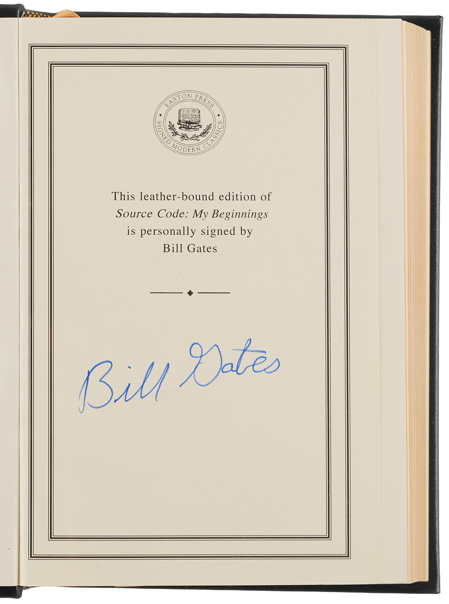 Signed book: Source Code: My Beginnings. Collector's edition. Norwalk, CT: Easton Press, 2025. Leatherbound hardcover, 6.5 x 9.75, 318 pages. Signed on the colophon in blue felt tip by Bill Gates. In very fine condition. Accompanied by a full letter of authenticity and grading from PSA/DNA, evaluating the autograph as a "10."