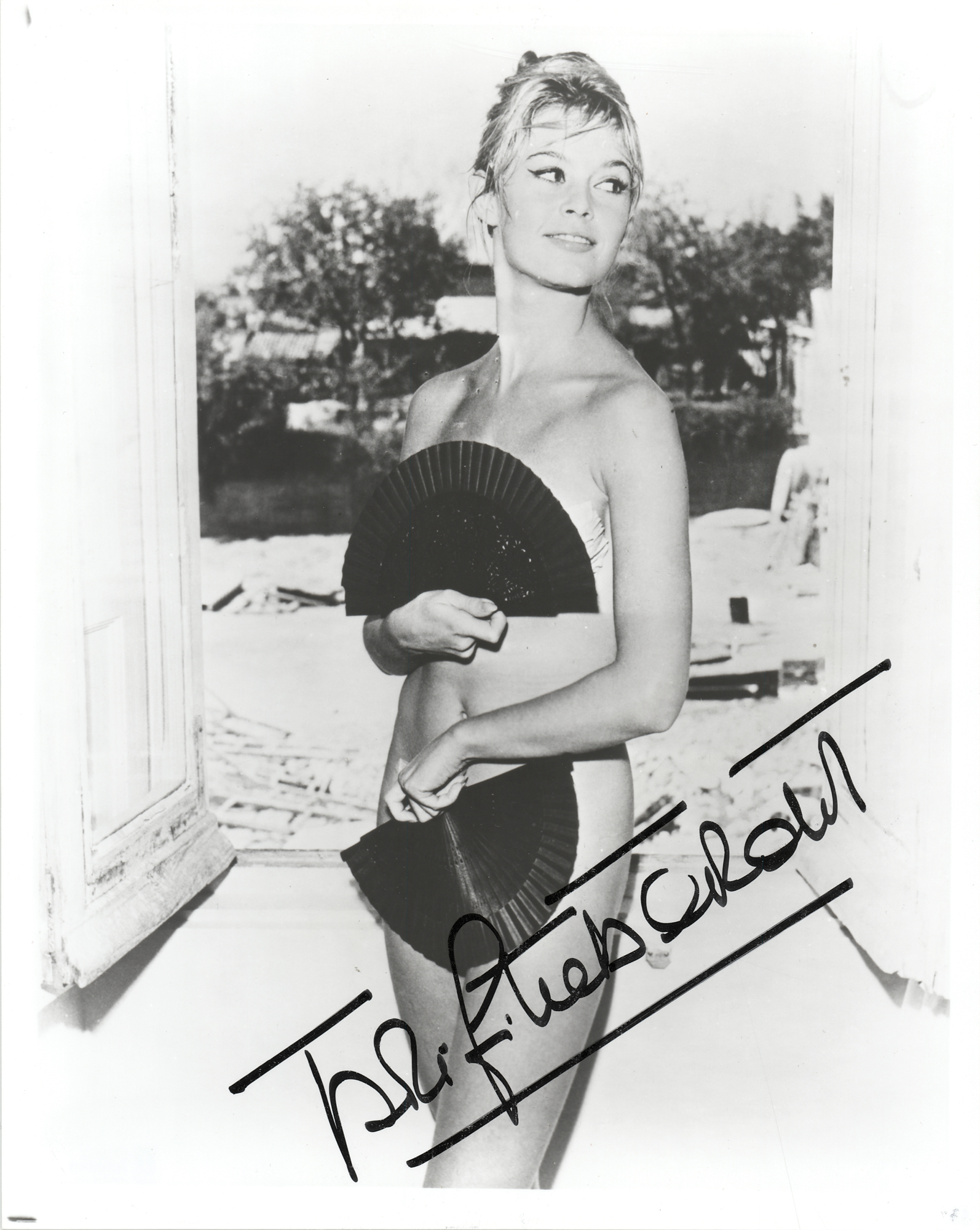 Glossy 8 x 10 the naked Brigitte Bardot covering herself with just two small hand fans, signed in black felt tip. In fine condition, with a Beckett label affixed to the reverse. Accompanied by a certificate of authenticity from Beckett Authentication Services.
