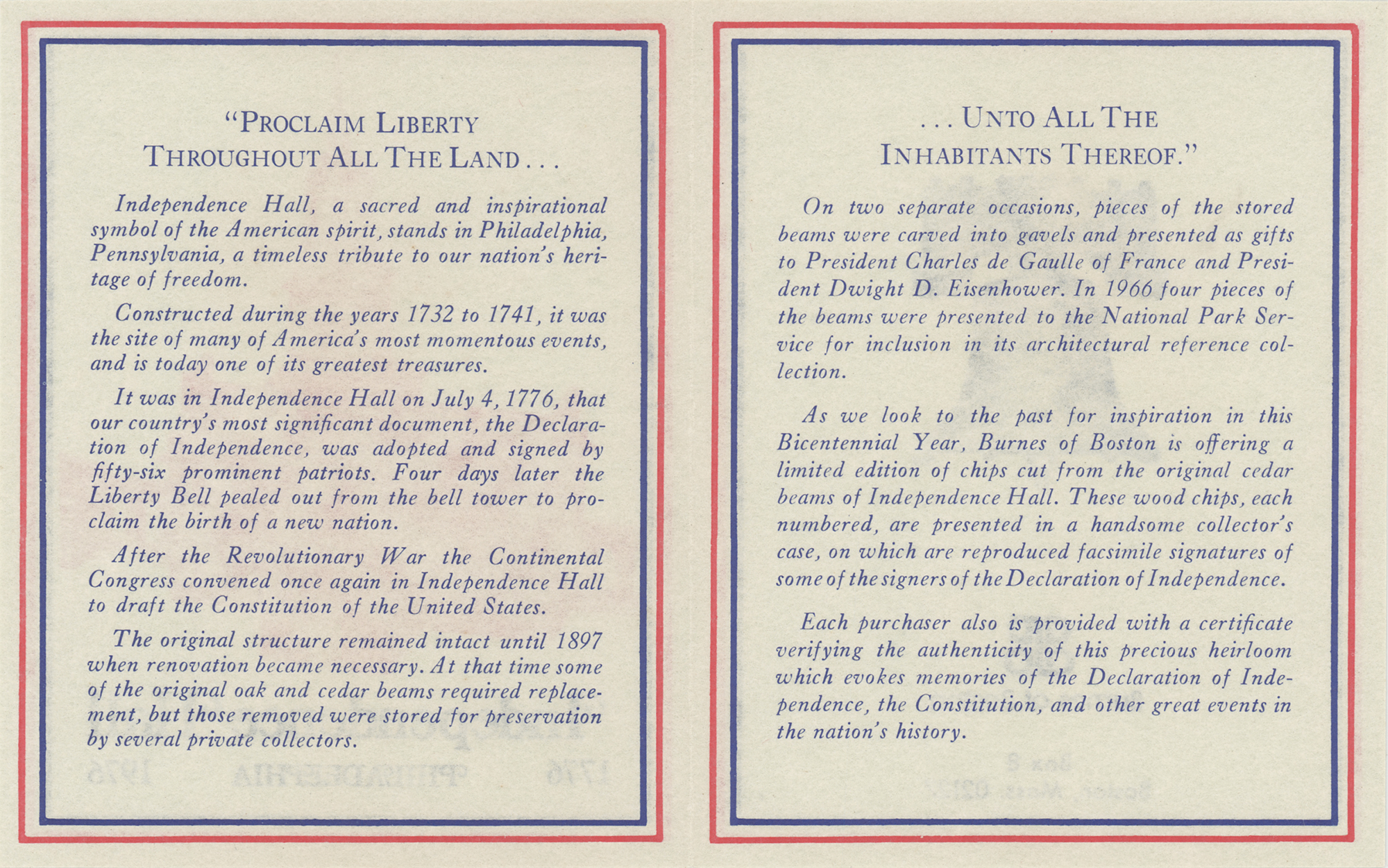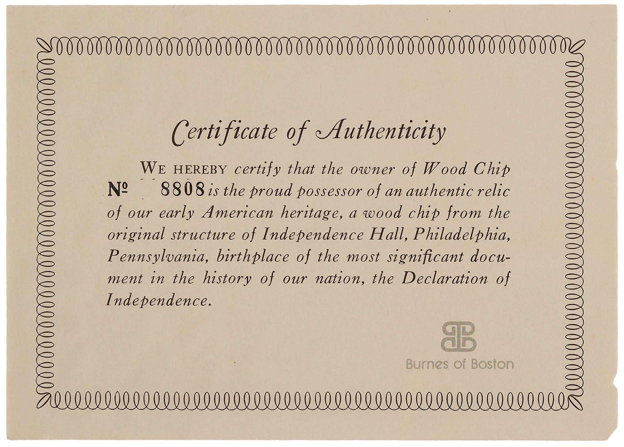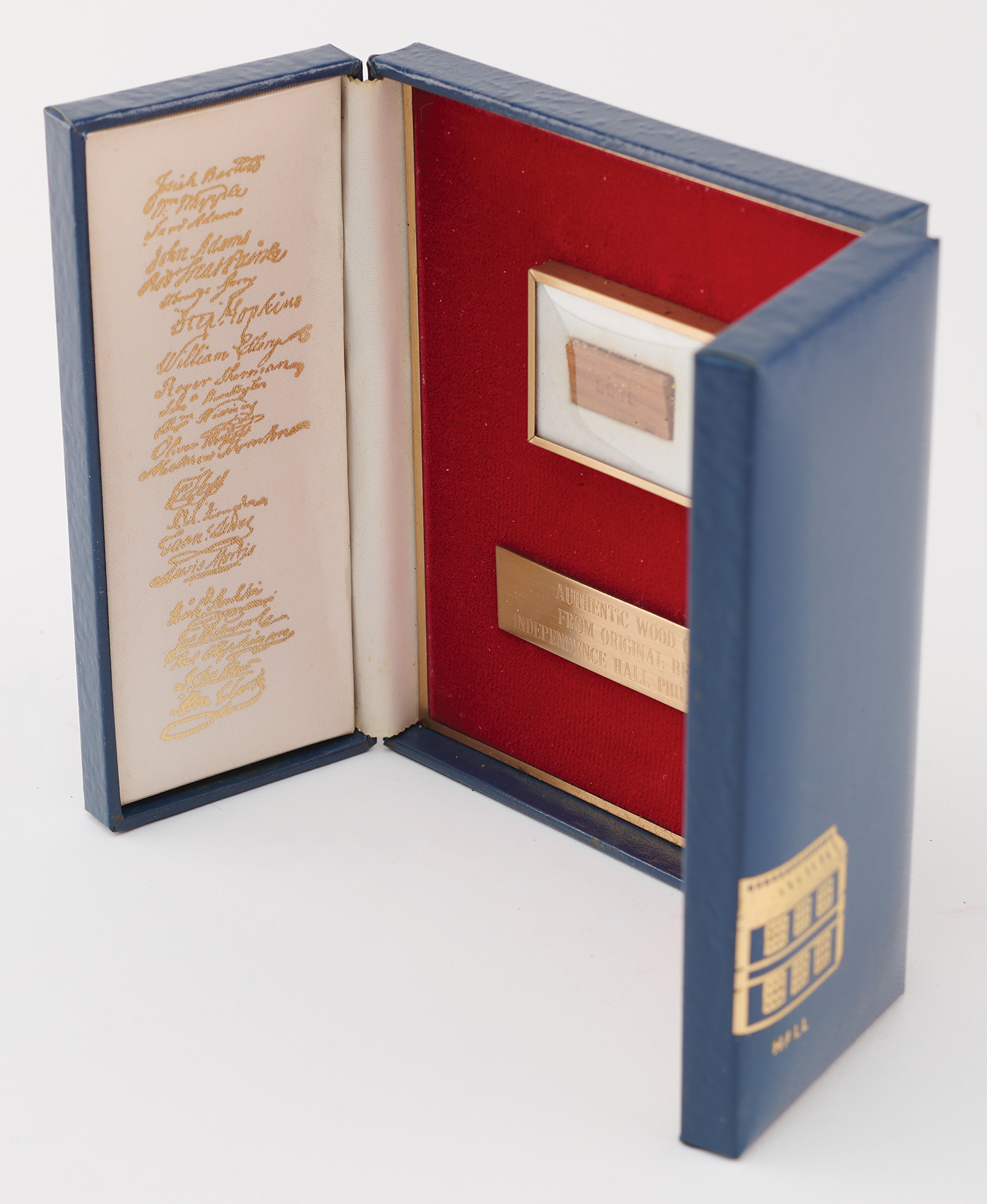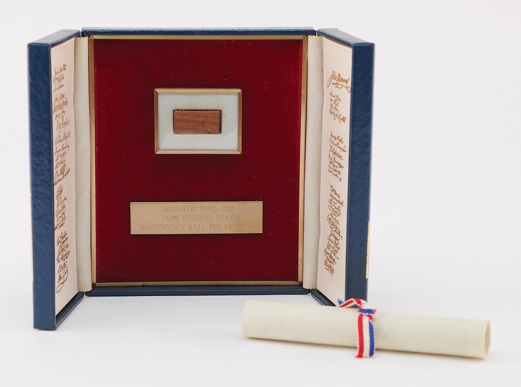 Limited edition display housing a 1˝ x .5˝ wood chip cut from the original cedar beams of Independence Hall in Philadelphia, numbered 8808 of an unspecified edition. Housed in a collector's case with an identification plaque and gold facsimile signatures of some of the signers of the Declaration of Independence. In fine condition. Accompanied by the original box, certificate, and booklet from Burnes of Boston, who released the edition during the bicentennial year of 1976.