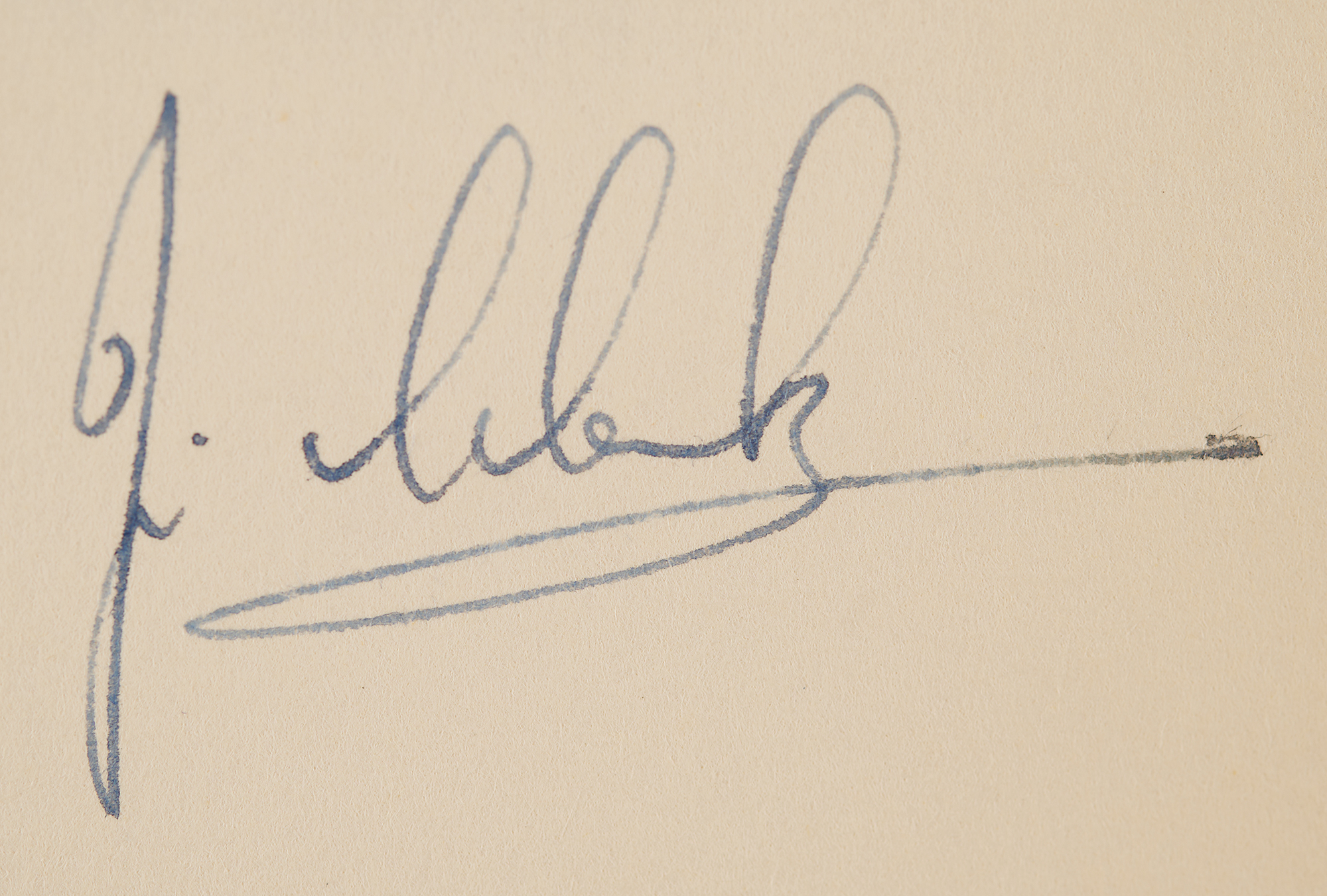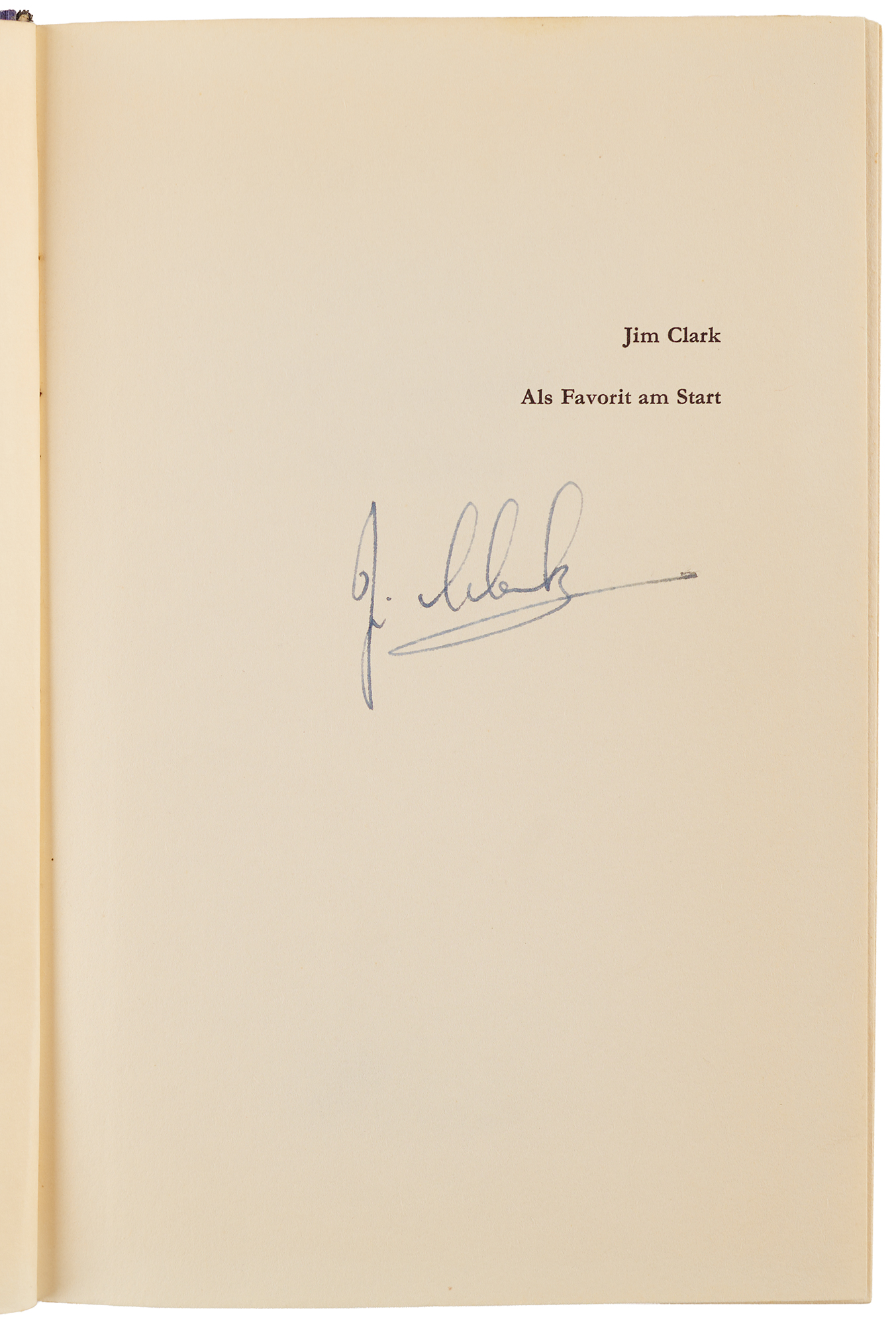 Scottish two-time world champion Formula One driver (1936-1968) who died in a crash during a race in Germany. Signed German-language book: Als Favorit am Start [Starting as Favorite]. Munich: Moderne Verlags GmbH, 1965. Hardcover, 5.75 x 8.25, 289 pages. Signed on the half-title page in black ink, "J. Clark." In fine condition, with sunning to the dust jacket spine.