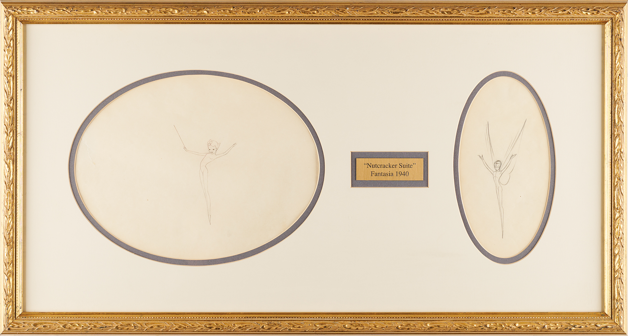(Walt Disney Studios, 1940) Original production drawings of two fairies from Fantasia, depicting the sprites in full-figure poses as they appeared in the film's gorgeous Nutcracker Suite, one holding a wand and the other with arms raised and wings spread. Both are accomplished in graphite on sheets of animation paper measuring 4 x 8 and 11 x 8. Double-matted and framed together to an overall size of 28.5 x 15. In overall fine condition, with a crease to the larger sheet.