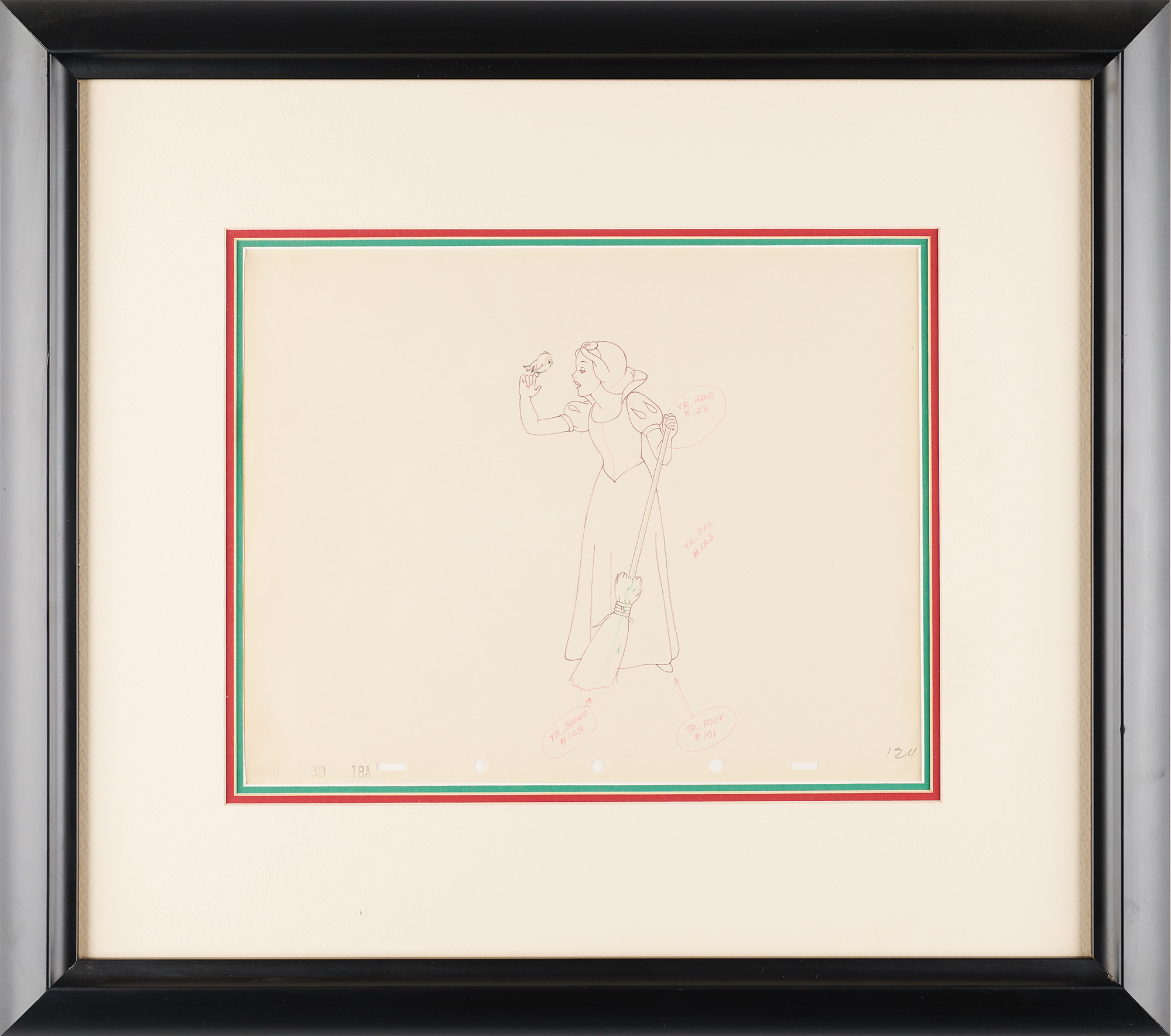 (Walt Disney Studios, 1937) Lovely original production drawing of the title character from Snow White and the Seven Dwarfs, depicting Disney’s original princess in a wonderful full-figure pose holding a broom and speaking to a small bird perched on her finger, with the character image measuring 3.5 x 5.75. Accomplished in graphite and colored pencil on 11.5 x 9 animation paper marked "124" in the lower right corner, and stamped "2001, 3D, 18A" in the lower left corner. Triple-matted and framed to an overall size of 20 x 17.5. In fine condition. An exemplary piece of original hand-drawn production art from Disney’s first animated feature film.