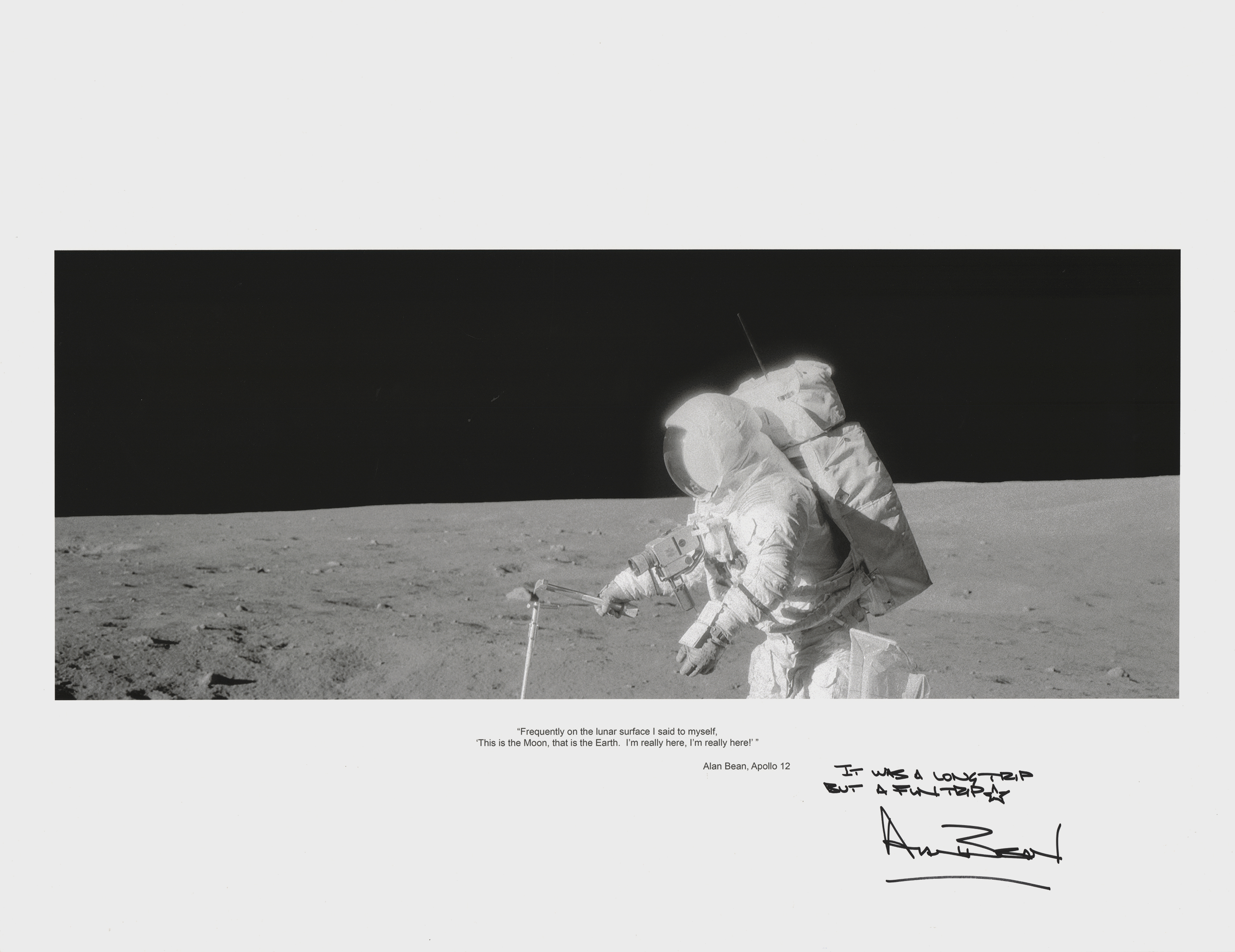 Photographic print of LMP Alan Bean conducting a lunar EVA during the Apollo 12 mission, 22 x 17, signed in the lower border in black felt tip, “It was a long but fun trip, Alan Bean.” The lower border also bears a printed quote from Bean: “‘Frequently on the lunar surface I said to myself, ‘This is the Moon, that is the Earth. I’m really here, I’m really here!’” In very fine condition.