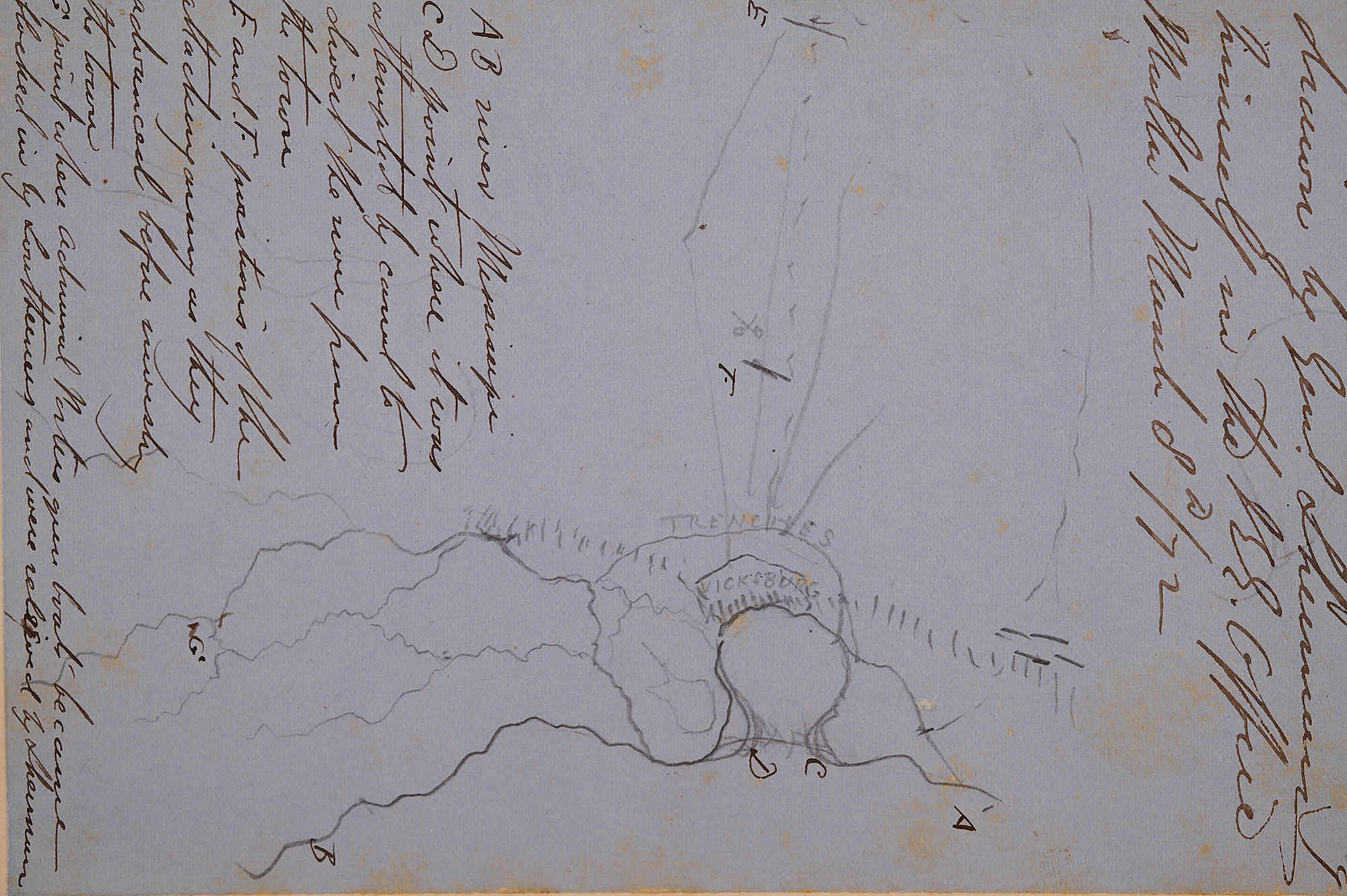 Hand-drawn map by William T. Sherman outlining the Union plan of attack for the Siege of Vicksburg, the decisive 1863 campaign that secured control of the Mississippi River, split the Confederacy in two, and is widely regarded as one of the war’s great turning points. The map, accomplished by Sherman in pencil on a blue 7.25 x 4.25 sheet, shows the Mississippi River bend, the town of Vicksburg, and Union trenches indicated west of the city. Lettered positions A through G are penned in a contemporary hand and explained in the lower section: “AB river Mississippi / CD point where it was attempted by canal to direct the river from the town / E and F positions of the attacking army as they advanced before invading the town / G point where Admiral Porters gun boats became blocked in by Southerners and were relieved by Sherman." The upper section is inscribed by a contemporary witness: “Plan of the attack of Vicksburg drawn by Genl. Sherman himself in the W. R. Office, Mullin, March 8th/72.” Affixed to a slightly larger backing sheet annotated in the right border: “Found amongst General Shutworth Ralors papers by his son in law, C. A. Croble, 1 June 1912.” In fine condition.