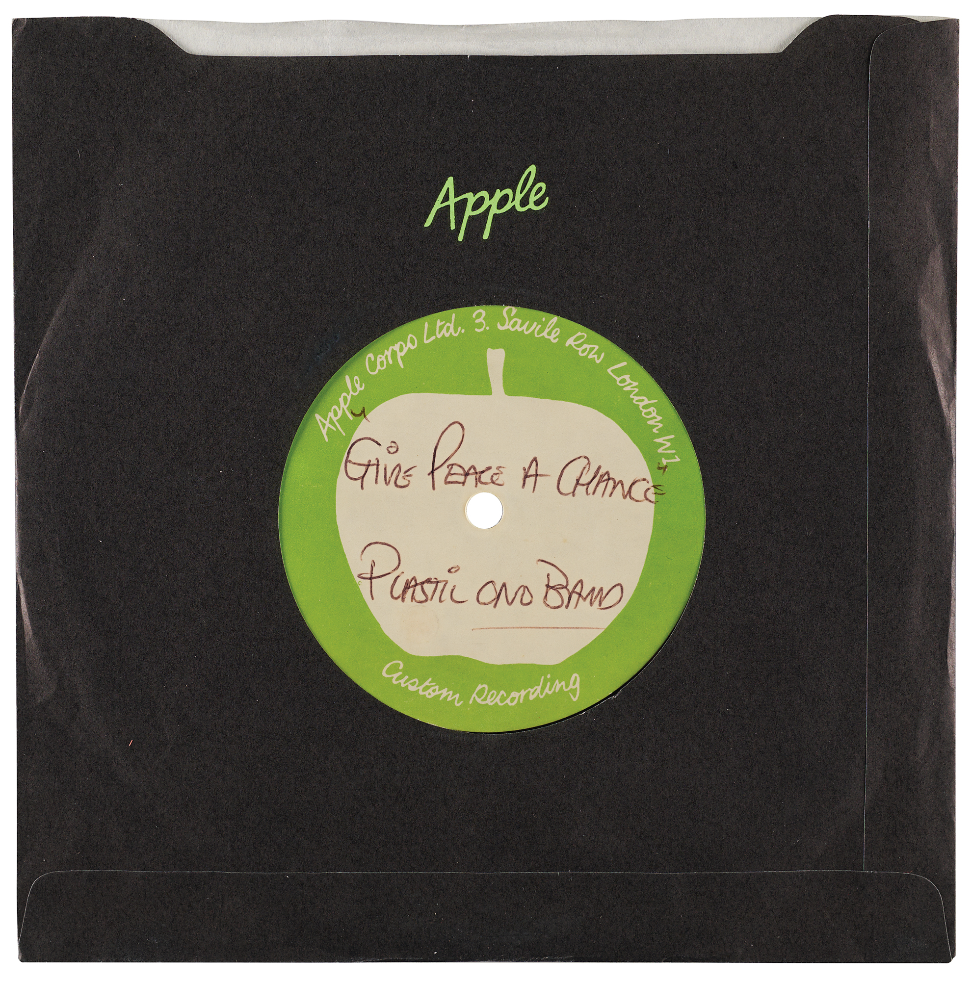 The acetate disc bears a green-and-white Apple Corps Ltd. label with handwritten notations by pioneering cutting engineer George Peckham: "Give Peace a Chance, Plastic Ono Band." Peckham became an engineer at Apple Studios in November 1968 as a trainee cutting engineer and subsequently moved to the position of chief Apple cutter.