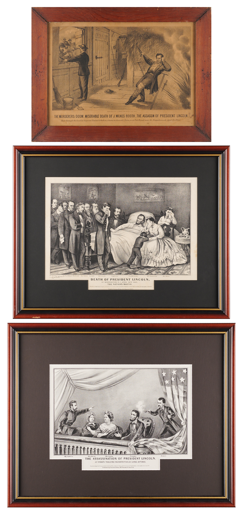 Three engravings related to the assassination and death of President Abraham Lincoln: a 12.75 x 9 engraving by Currier & Ives entitled “The Assassination of President Lincoln, at Ford’s Theatre Washington, D.C. April 14th, 1865”; a 13.75 x 10.25 engraving by Currier & Ives entitled “Death of President Lincoln, at Washington, D.C. April 15th 1865, The Nation’s Martyr”; and a 13.5 x 9.5 engraving by J. L. Magee entitled “The Murderers Doom. Miserable Death of J. Wilkes Booth, The Assassin of President Lincoln / Shot through the head by Sergeant Boston Corbett in a barn on Garrett’s Farm, near Port Royal, near the Rappahannock, April 25, 1865.” Each is individually framed, with sizes ranging from 16.25 x 12.5 to 20.75 x 16.75. Publication dates are unknown. In overall very good to fine condition.
