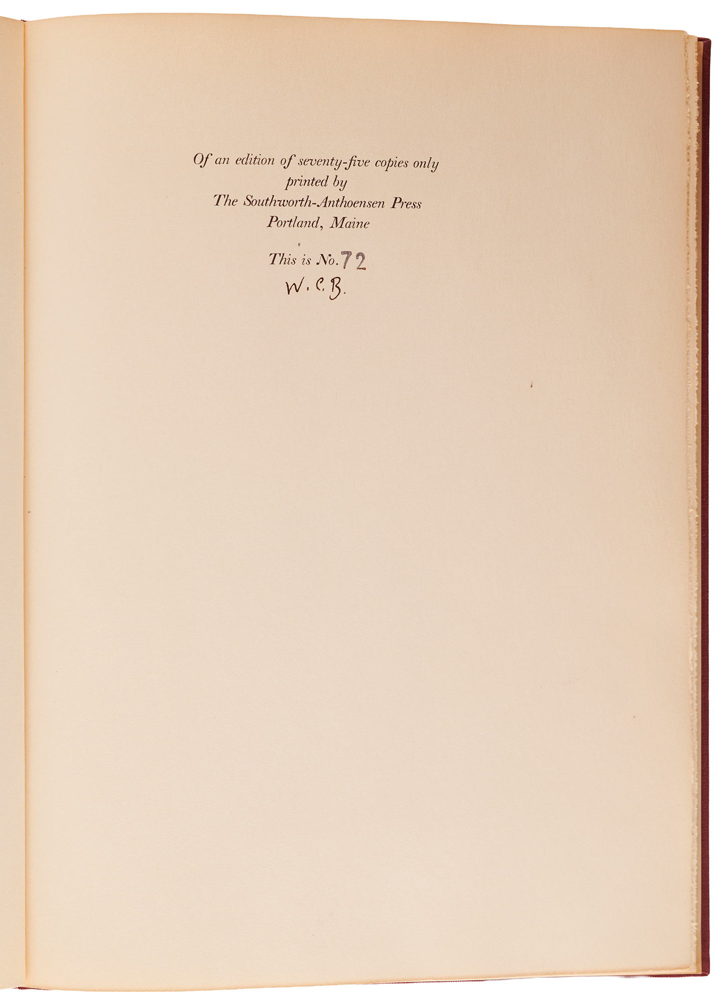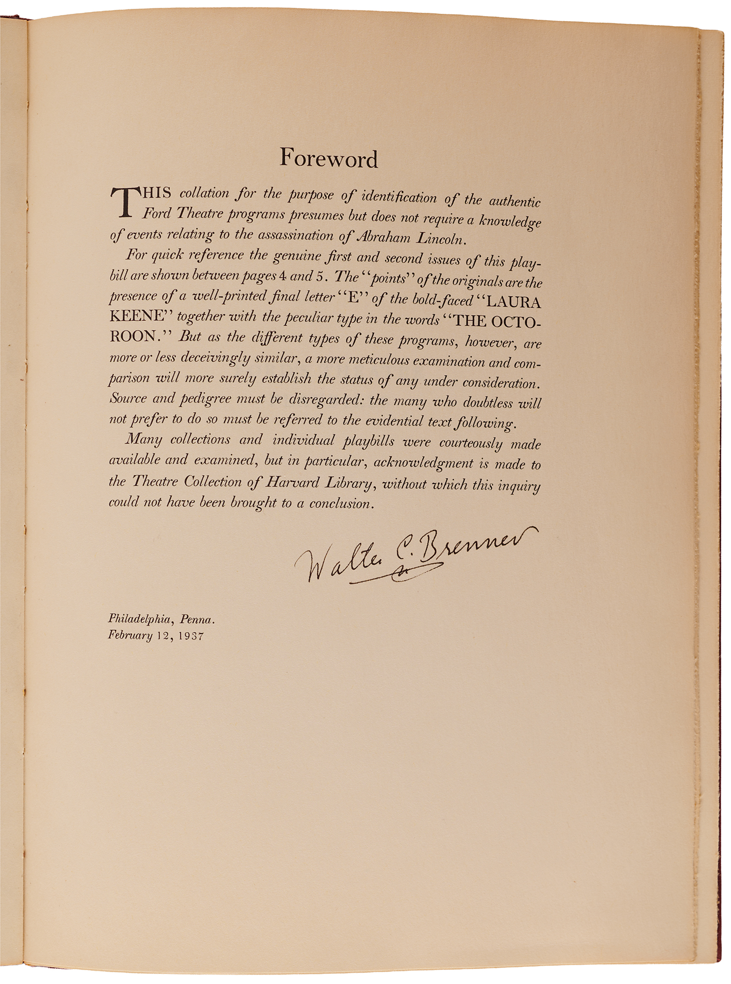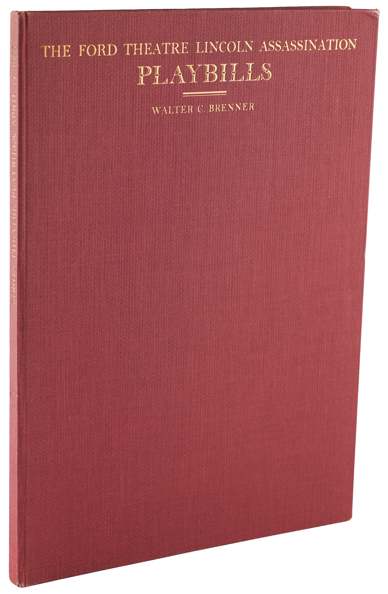 Signed book: The Ford Theatre Lincoln Assassination Playbills. Limited first edition, numbered 72/75. Philadelphia: Privately printed, 1937. Red cloth-bound hardcover with gilt titling, 7.5 x 10, 16 pages. Signed on the foreword page in black ink by the editor, Walter C. Brenner, who also signs his initials on the colophon. The book contains its original supplement pamphlet with matching edition number, which begins: “To many no reminder is needed that this year marks the seventy-fifth anniversary of the assassination of Abraham Lincoln. This little homemade pamphlet in passing records a few additional details relating to the Ford Theatre playbills of that day, but more especially wishes to state that ever since that event the true facts concerning the playbills were known to some and should have been known to others, and that these facts were all but published over forty years ago.” In fine condition. A scarce, highly regarded Lincoln-assassination reference work that attempted to separate genuine April 14, 1865 playbills from later reprints or spurious examples, laying out identifying characteristics and correcting misconceptions that had circulated for decades.