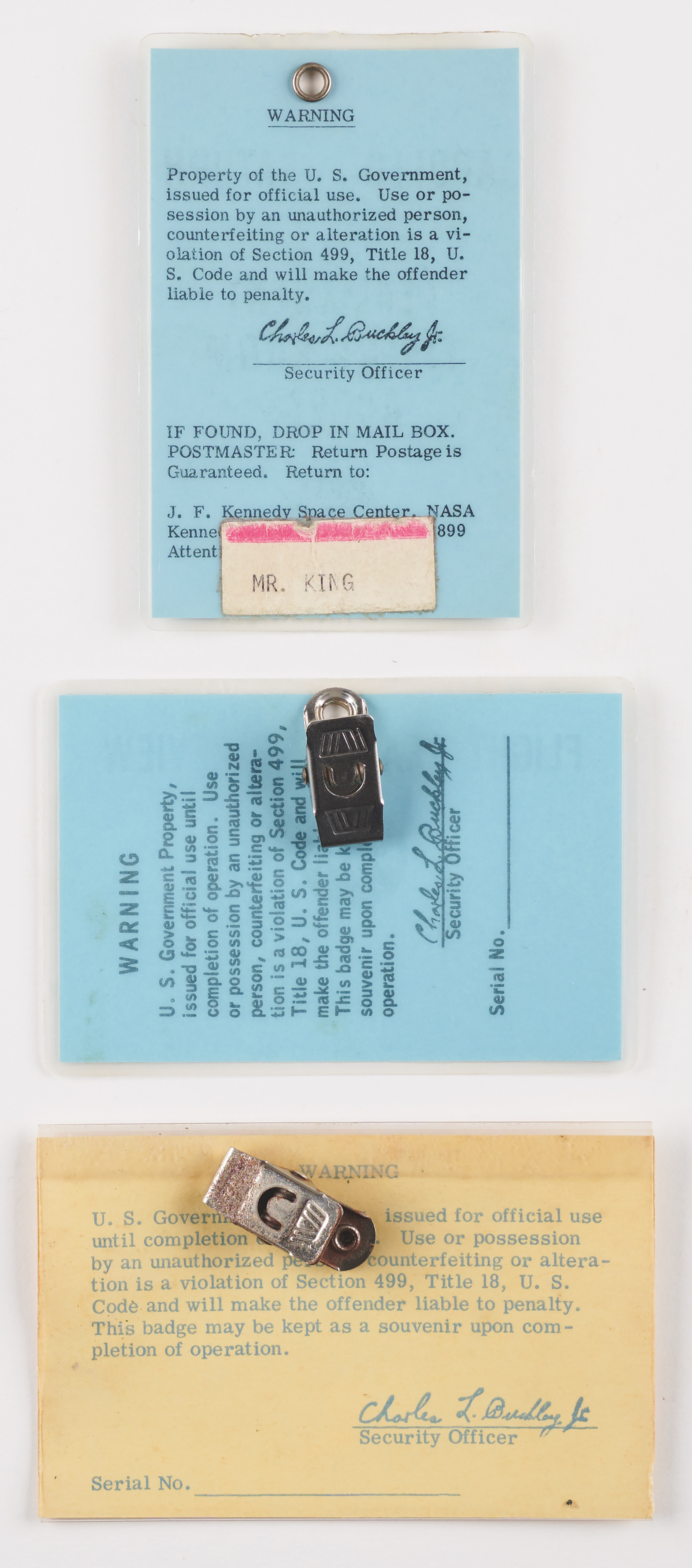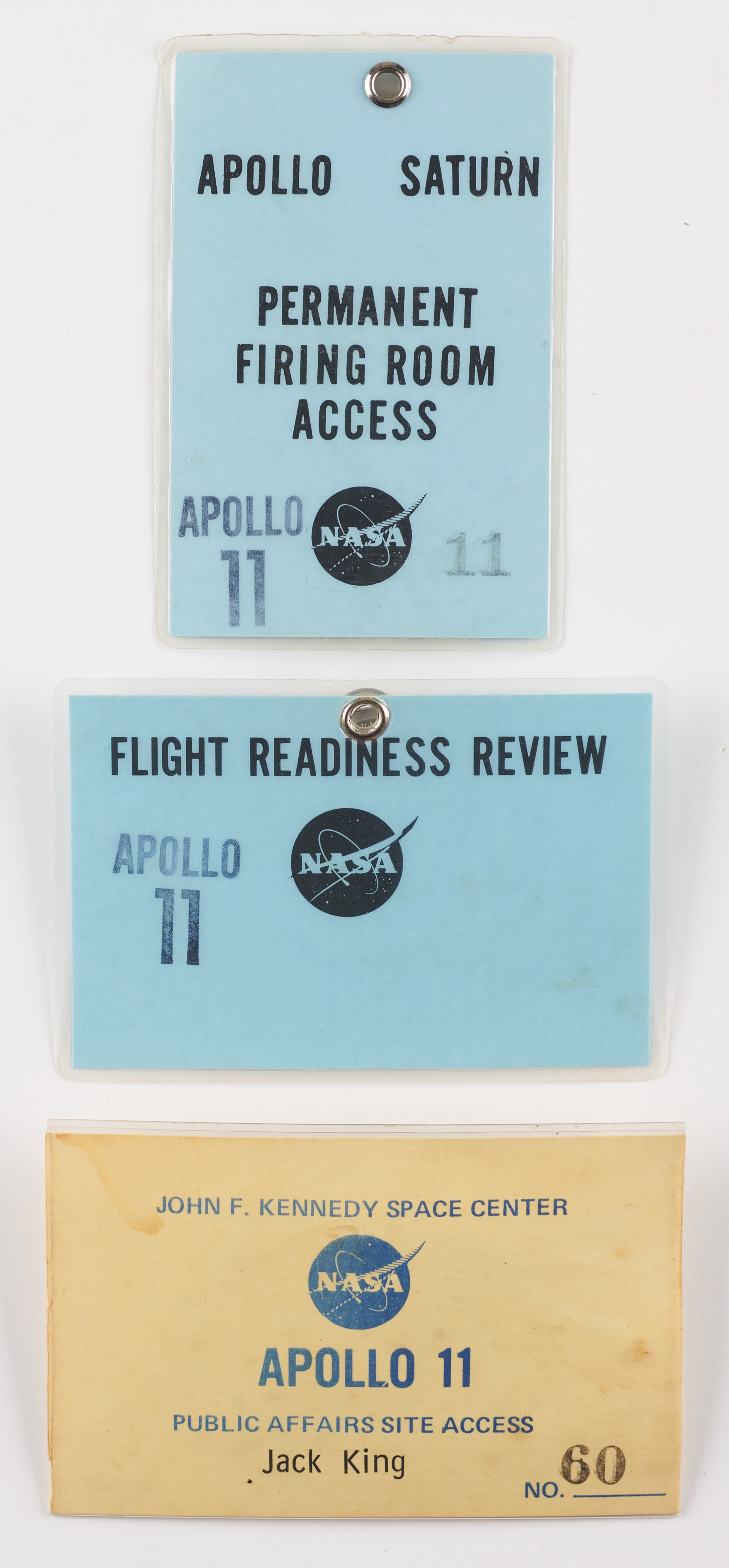 Set of three original laminated NASA Kennedy Space Center badges for Apollo 11, 2.5 x 3.75 and 4 x 2.5, including: a "Flight Readiness Review" pass stamped "Apollo 11"; an Apollo Saturn "Permanent Firing Room Access" pass, stamped "11"; and a "Public Affairs Site Access" pass issued to Jack King, stamped "60." In overall fine condition, with light staining to public affairs badge. The Flight Readiness Review and Public Affairs passes originate from the collection of Jack King, the KSC Chief of Public Information during projects Mercury, Gemini and Apollo (1931-2015), who provided public announcements and commentary for several of the mission launches, including the announcement of the Apollo 11 launch, which earned him the nickname ‘Voice of Apollo.’