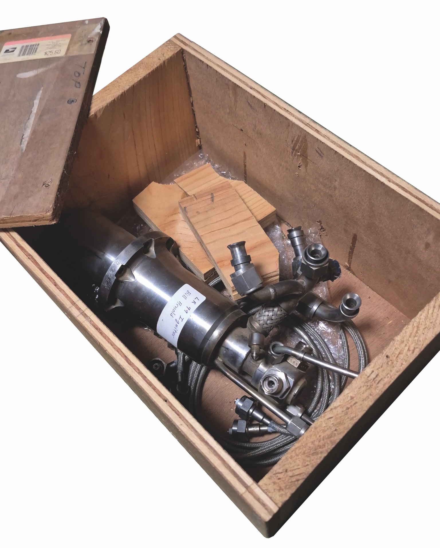 Export restricted (ITAR), sale only to US Citizens and Organizations. Reaction Motors LR-99 igniter or starter assembly, a component of the gas-generator start system used on the Reaction Motors XLR-99 rocket engine that powered the North American X-15 hypersonic research aircraft. The assembly measures 13˝ in length and weighs approximately 13 pounds, and bears a label marked, “LR 99 Igniter, Bill Arnold,” indicating that the unit derives from the collection of William ‘Bill’ Bernard Arnold, a Field Service Engineer for Reaction Motors. In fine condition. Accompanied by two spiral-bound manuals from the Reaction Motors Division of Thiokol Chemical Corporation, one entitled “Model Specification 91 M, Turborocket Engine XLR 99-RM-1” and “Model Specification 91N, Turborocket Engine YLR99-RM-1.”