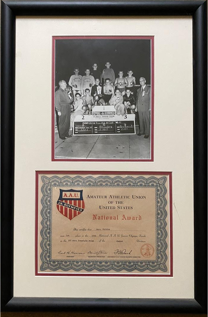 While a very good student, Marc was quite often a disruptive force and several teachers found it necessary to move his desk outside the classroom. Marc took a liking to sports and distinguished himself as an outstanding Little League baseball player. The swimming pool, however, became the bane of his existence. He was the only child (until age 10) at the city plunge who wore the hideous orange vest to ensure he didn't drown. Sick of being laughed at and the subject of constant derision, he began to "study" and "break down" the swimming "process." Suddenly, overnight, he declared "I can swim and I'll show you!" He competed in competitive swimming, age group 11 to 12 years, and excelled. The Alhambra YMCA, age group 11 to 12, won a National Title in 1956 in the 200 Meter Freestyle Relay at the Los Angeles Memorial Coliseum Pool.