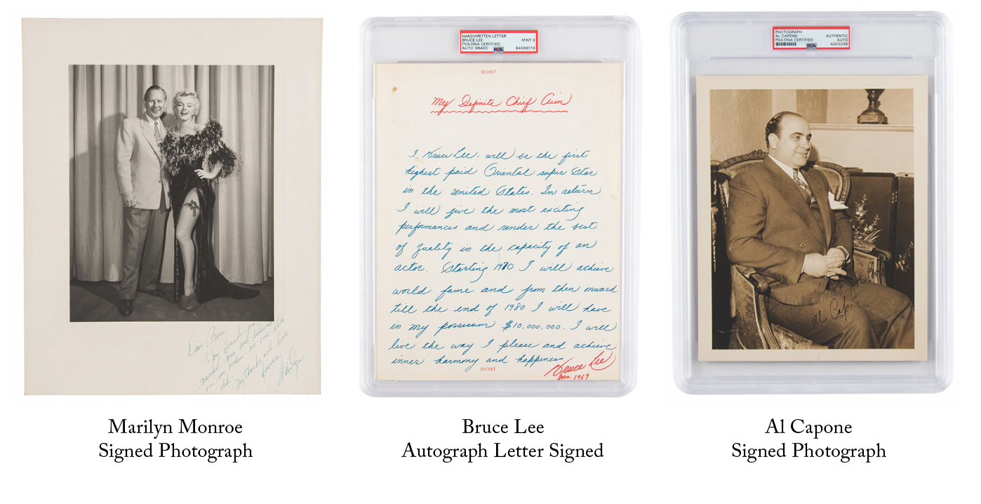 The "collecting bug" reared its ugly head once again in 2006 when Mr. Perkins succumbed to the deceitful, dishonest, forgery-ridden hobby of autograph collecting. Making every mistake possible and lured in by every con artist around, Mr. Perkins finally settled down and focused his initially scatter-shot approach. Given his seemingly obsessive nature, he established the world's largest collection of legitimate, authenticated, signed Marilyn Monroe photos, Bruce Lee signed photos and letters, and Al Capone signed items, all to be offered through RR Auction. Mr. Perkins quit collecting upon Mary's death in January 2024. He always maintained she was his North Star, supporting and encouraging him in every crazy endeavor he embarked upon.
